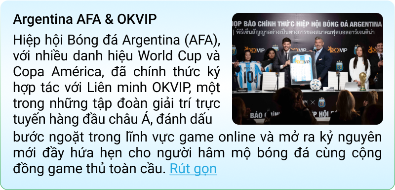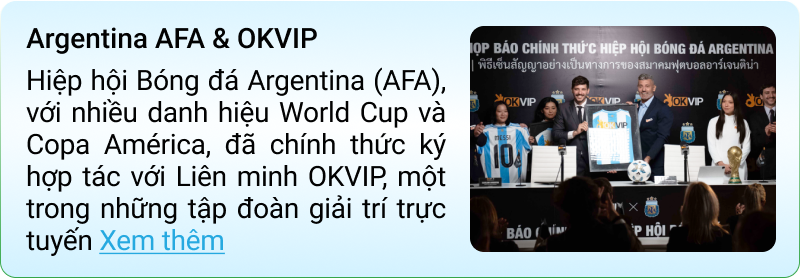 Hiệp hội Bóng đá Argentina (AFA) với nhiều chiến thắng vang dội tại World Cup và Copa América, đã chính thức hợp tác cùng OKVIP - Trang Liên Minh các thương hiệu giải trí trực tuyến hàng đầu Châu Á. Sự hợp tác này được công bố vào tháng 6 năm 2024, đánh dấu một bước ngoặt quan trọng trong lĩnh vực game online, hứa hẹn mang lại nhiều trải nghiệm thú vị và đột phá cho người hâm mộ bóng đá và cộng đồng game trên toàn thế giới.
